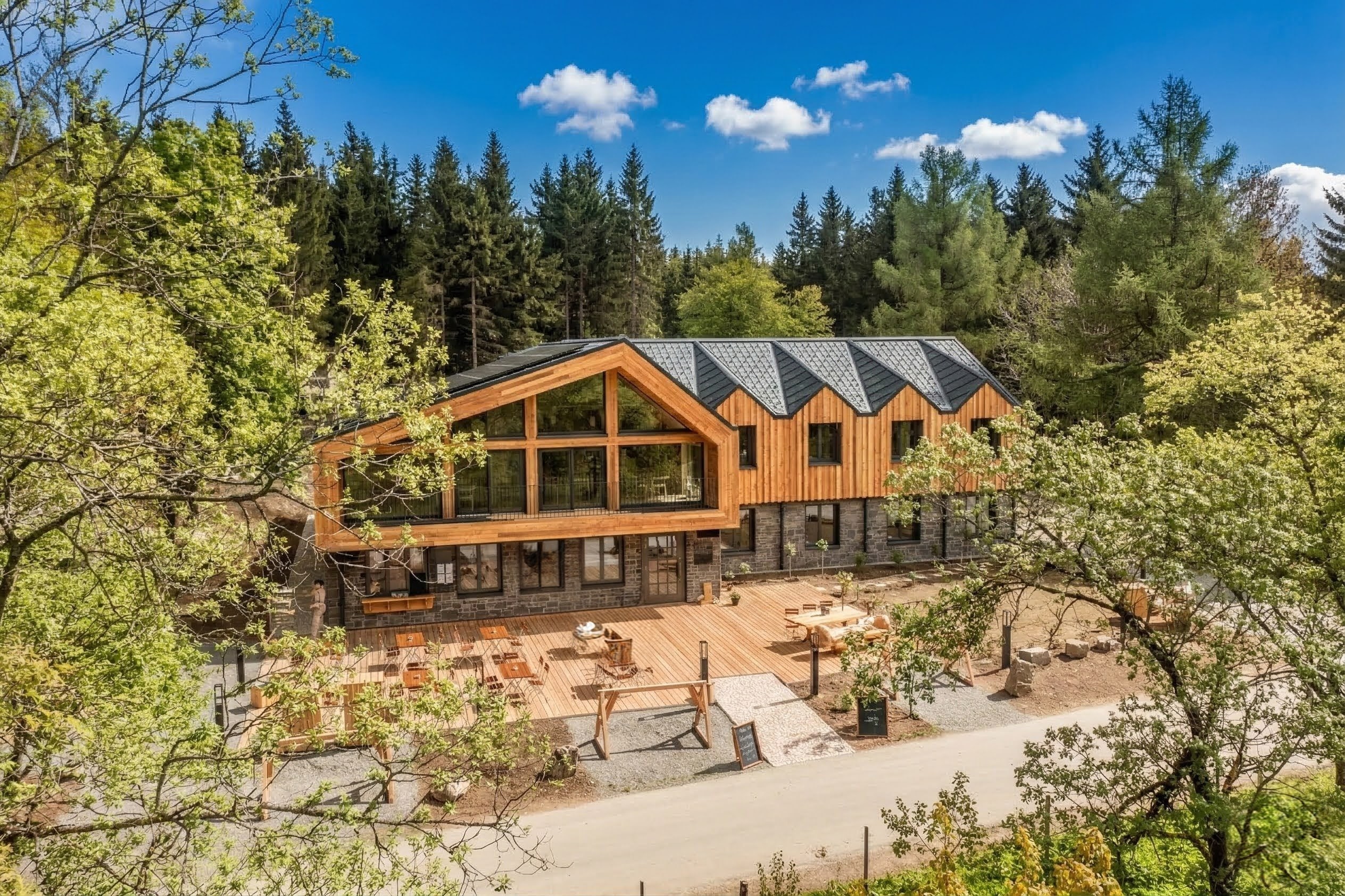 Besucht uns und genießt die schöne Holzterrasse mit Biergarten, den MTB-Flow-Trail und den Boulder-Block!